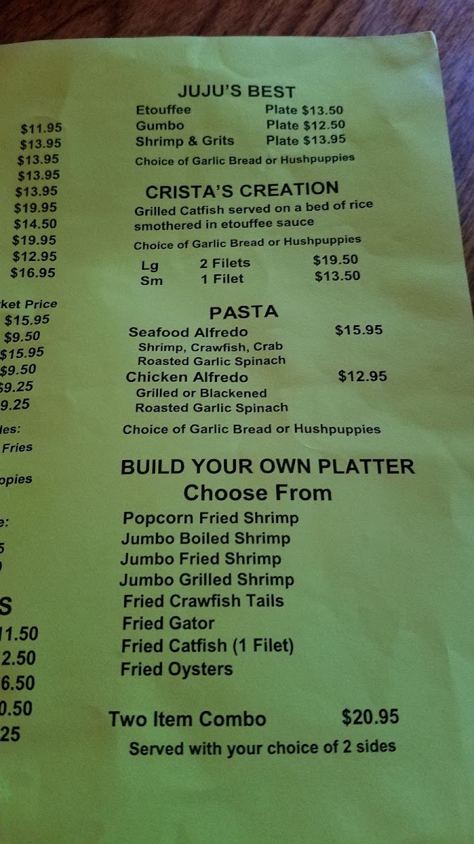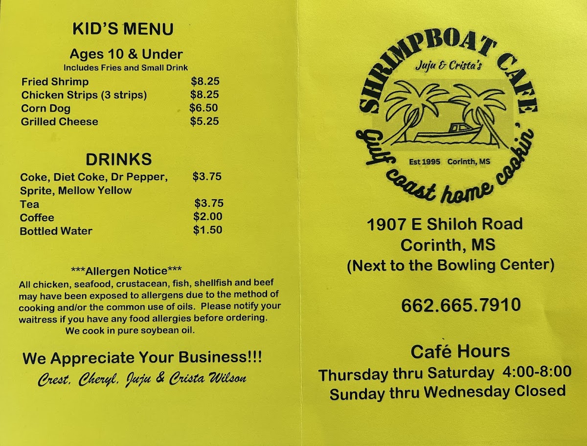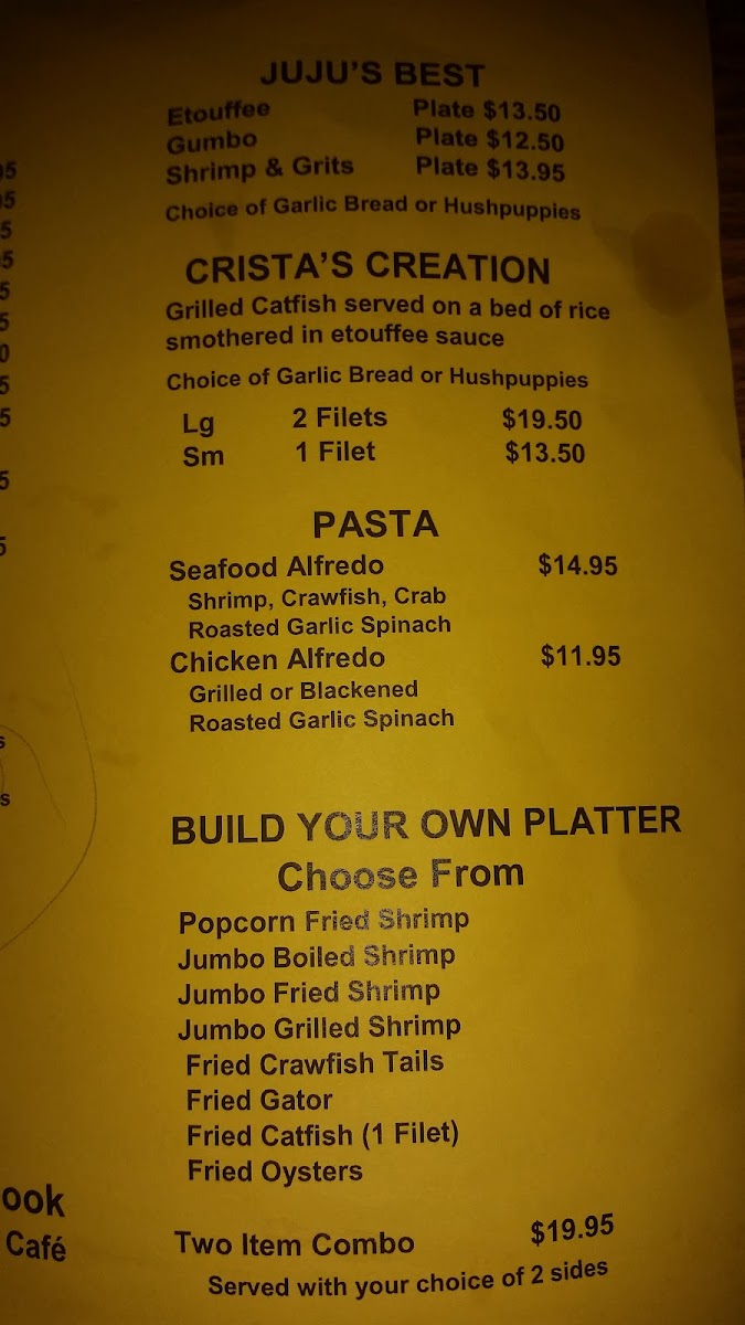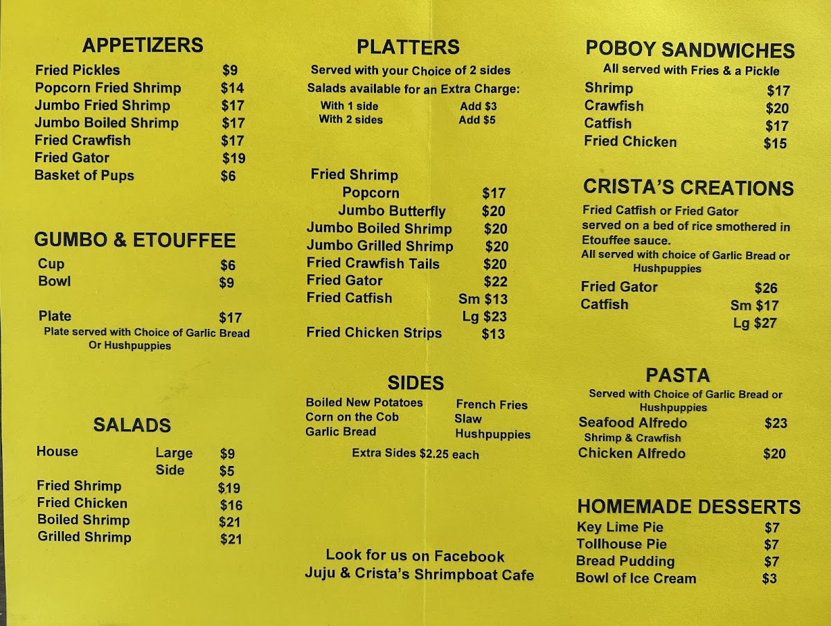 Looking for a cozy spot with fresh seafood and Southern charm? The Juju's Shrimpboat Cafe Menu offers a variety of mouthwatering dishes that perfectly capture the flavors of the Gulf Coast. Whether you're craving a classic shrimp po' boy, crispy fried catfish, or a delicious seafood gumbo, there’s something to satisfy every palate. You’ll find hearty meals like shrimp and grits, stuffed hushpuppies, and savory sides, all crafted with the finest ingredients and the love of Southern cooking. Located in Corinth, MS, Juju’s is the place to be for a casual yet flavorful dining experience. So, grab a seat and dive into a menu that’s filled with fresh seafood and Southern classics that’ll make you feel right at home.