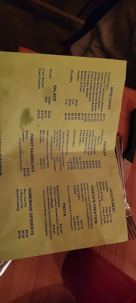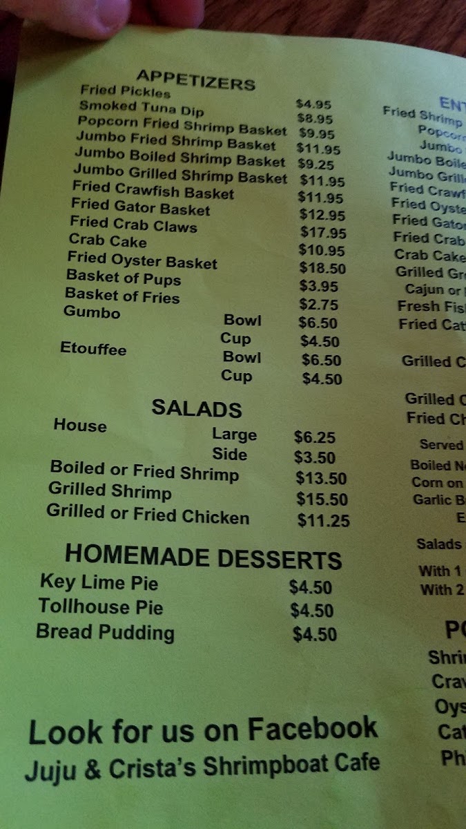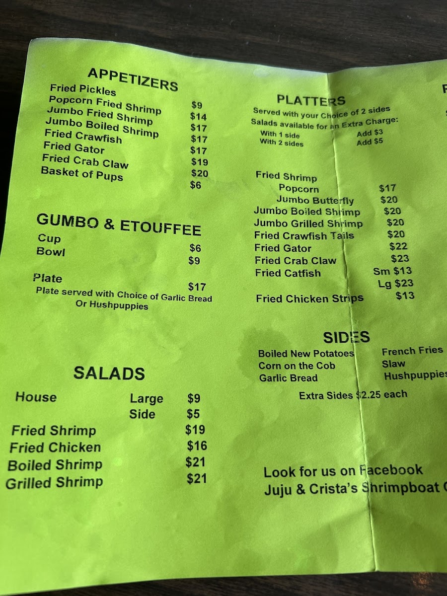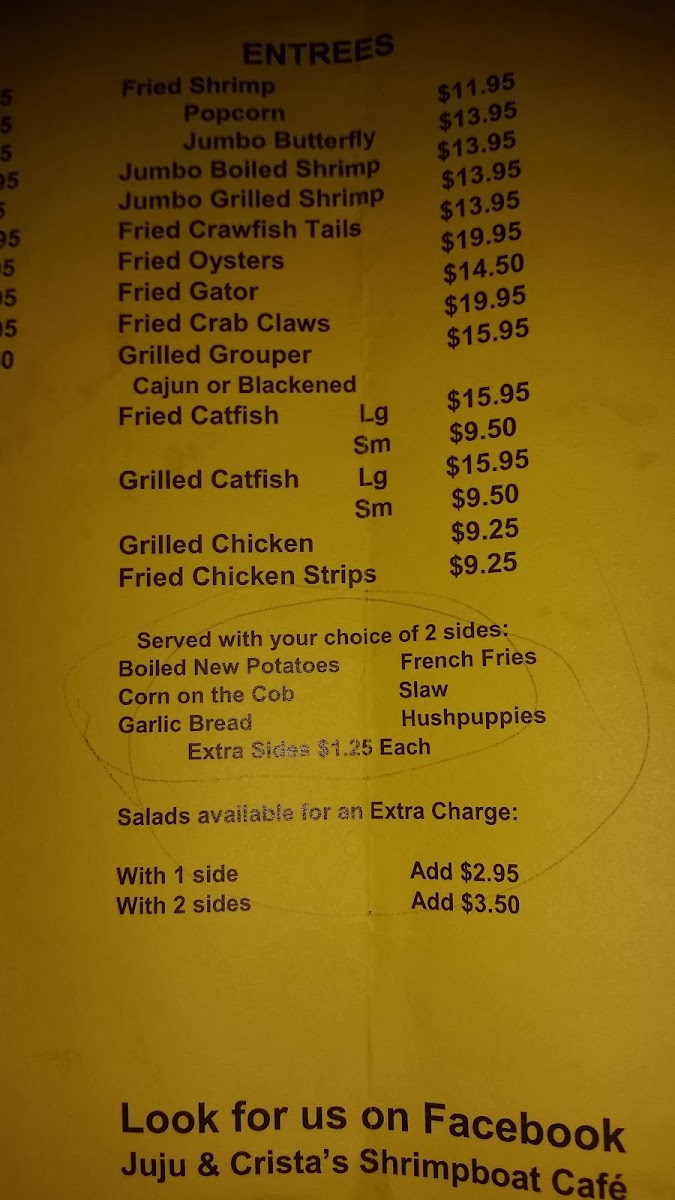 Looking for a cozy spot with fresh seafood and Southern charm? The Juju's Shrimpboat Cafe Menu offers a variety of mouthwatering dishes that perfectly capture the flavors of the Gulf Coast. Whether you're craving a classic shrimp po' boy, crispy fried catfish, or a delicious seafood gumbo, there’s something to satisfy every palate. You’ll find hearty meals like shrimp and grits, stuffed hushpuppies, and savory sides, all crafted with the finest ingredients and the love of Southern cooking. Located in Corinth, MS, Juju’s is the place to be for a casual yet flavorful dining experience. So, grab a seat and dive into a menu that’s filled with fresh seafood and Southern classics that’ll make you feel right at home.